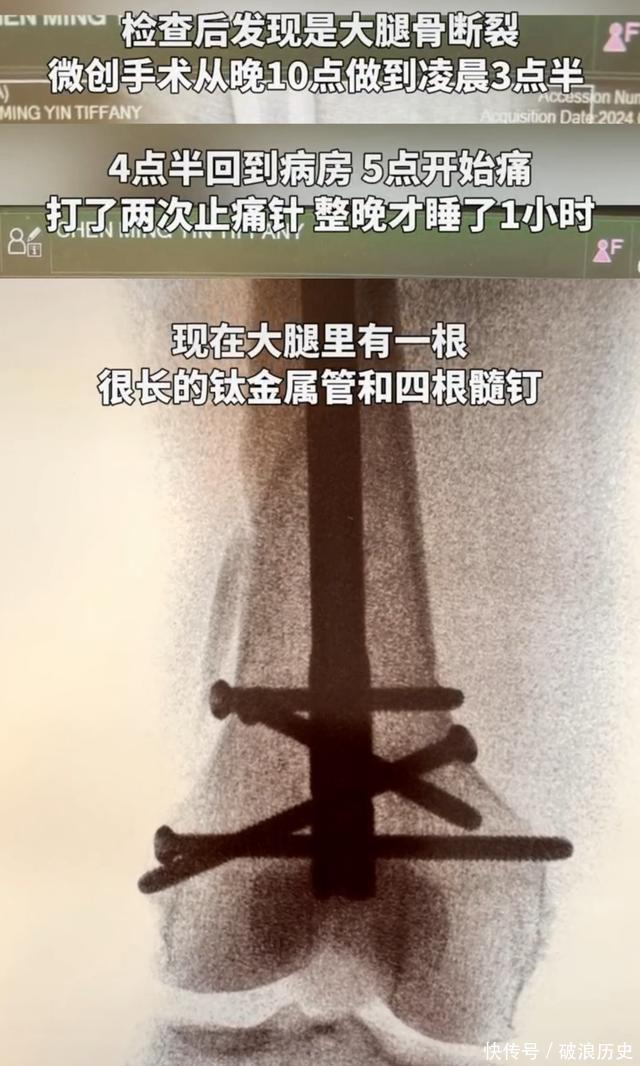 医师将她送往病院,立马进行了手术,手术时分长达五个半小时,最终向太的腿内被打入一根很长的钛金属管和四根髓钉,这才缓解了病情。