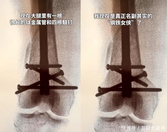 向太还晒出经过手术后腿部拍摄的片子,只见她大腿里被放入了一根很长的钛合金属管还有四根髓钉,对此,向太还玩笑称:“我当今是果真名副其实的钢铁女侠了”全球最大最正规赌场网,这份鉴定乐不雅属实是令东谈主佩服。